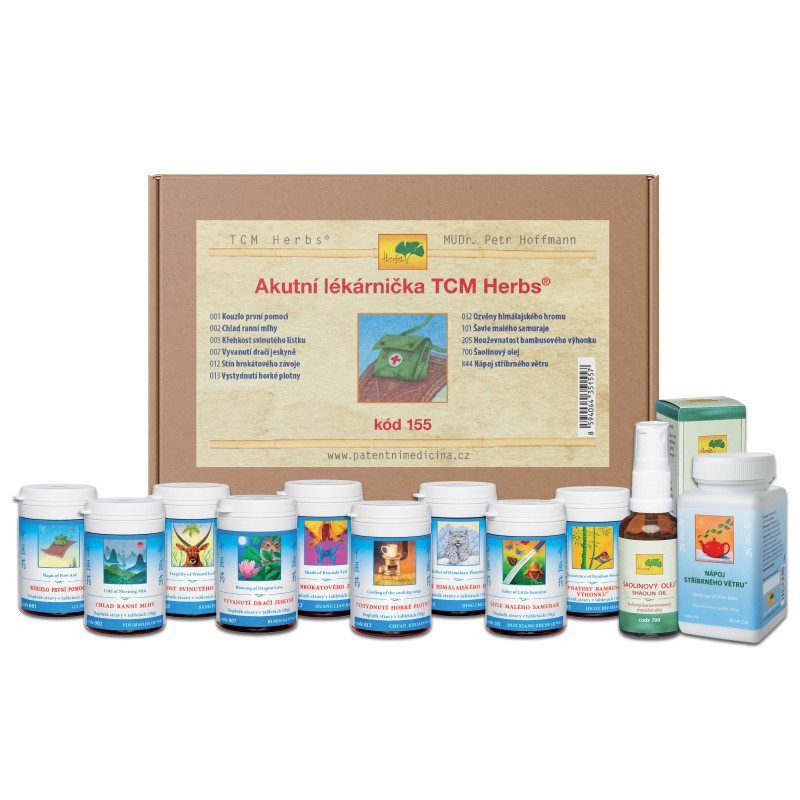 Akútna lekárnička TCM HERBS, kód 155 - obsahuje výživové doplnky ako prvú a okamžitú pomoc na Nachladnutia, Virózy, Alergie, Kašeľ, Hnačky, Poranenia, Úrazy, Oči a nos, Koprivka, Pokožka - Tradičná čínska medicína.
